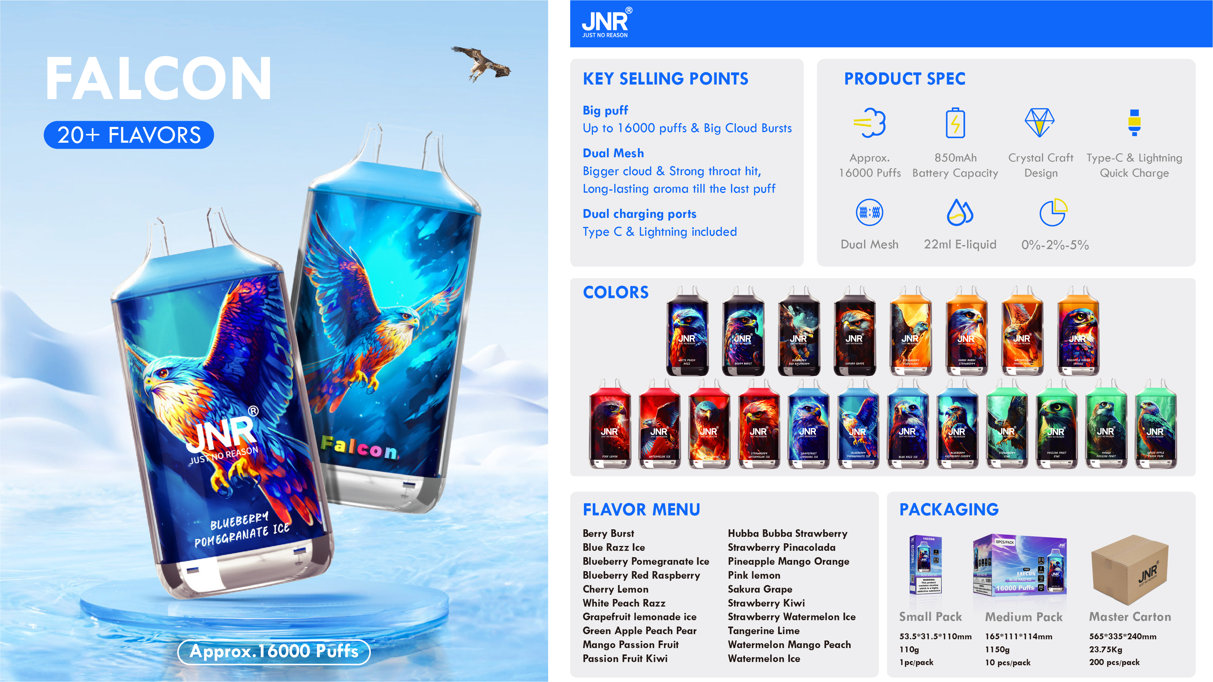 JNR Falcon Disposable Vape 16000 Puffs is crafted for vapers who crave both performance and aesthetics. This sleek device delivers up to 16,000 satisfying puffs, powered by a reliable 850mAh rechargeable battery. Whether you prefer 0%, 2%, or 5% nicotine, the Falcon adapts to your style.